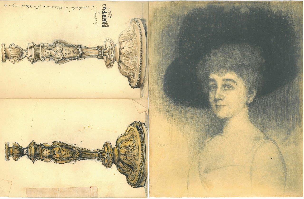 Dont inventaire détaillé du mobilier conservé dans le château de Baye avant 1914 - Liste des objets d'art ayant appartenu à la famille impériale et qui furent hérités par la famille de Baye - Dessin d'une paire de chandeliers en bronze doré achetée par le baron de Baye à Moscou en 1910 - Note manuscrite du général Brissaud-Desmaillet, commandant les troupes de la Sarre, du 14 septembre 1920 rappelant les services rendus par la baronne de Baye durant son séjour en Allemagne occupée : " Depuis l'armistice, Mme la Baronne de Baye s'est dépensée sans compter pour assurer le parfait fonctionnement de la cantine de gare créée par Melle de Baye. Sans cesse aux côtés de sa fille, dans les beaux et les mauvais jours, elle a su imprimer à la cantine un caractère de home familial ouvert à tous les Français, militaires et civils. Mme de Baye, qui pourrait jouir tranquillement du confortable exceptionnel de son hôtel à Paris et de son château, a fait, comme sa fille, le sacrifice de son existence parisienne, pour se consacrer entièrement à ses uvres de Sarrebruck dans un milieu prussien, bien plus hostile à la France que le milieu rhénan. Toujours à son poste dans les moments de trouble, elle a circulé crânement au milieu des émeutiers d'octobre 1919, en tenue d'infirmière, arborant les couleurs françaises