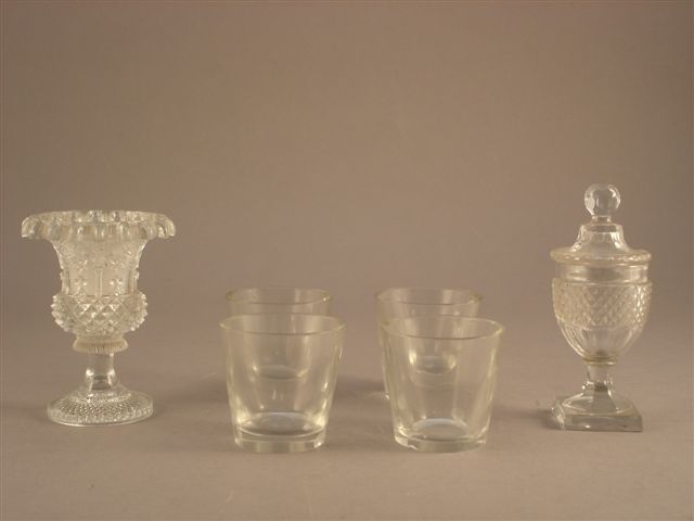 COUPE COUVERTE à décor de pointes de diamant et petit VASE de forme Medicis à décor néogothique en cristal. Joint une suite de quatre verres tronconiques.