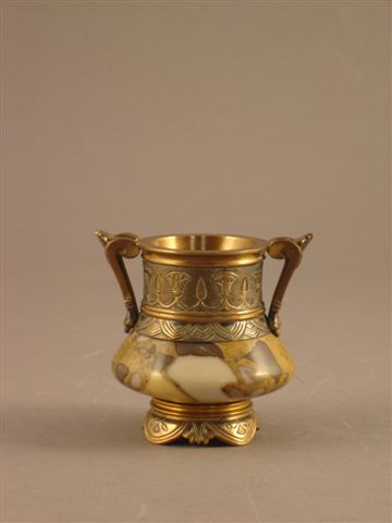 Petit VASE en marbre. Panse évasée. Monture en bronze ciselé d'un décor tournant de feuilles de lotus et motifs géométriques. Haut. 8 cm.