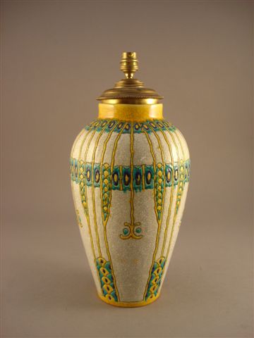 BOCH Frères. VASE en céramique monté en lampe à décor d'émaux translucides cloisonnés bleus et jaunes sur fond craquelé blanc de végétaux stylisés. Porte au revers la marque "BOCH Frères, Made in Belgium" et en creux le numéro 267.