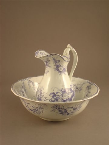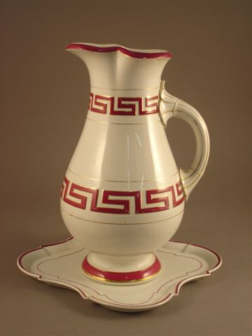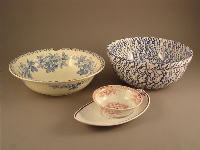 Réunion de TROIS BROCS DE TOILETTE en faïence polychrome. On y joint deux vasques, deux plateaux et une coupelle pour meuble de toilette.