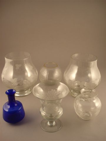 ENSEMBLE DE VERRERIES comprenant 3 vases à décor de pampres, un vase BACCARAT à col resserré orné d'une frise tournante de motifs géométriques, un vase boule à panse godronnée et un vase à col droit évasé en verre bleu.