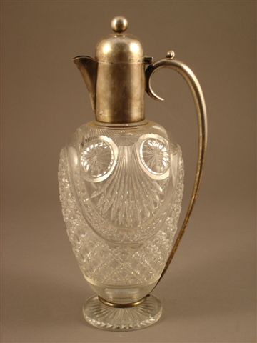 CARAFE en VERRE à décor biseauté d'étoiles rayonnantes et d'octogones en relief. Base circulaire, panse ovoïde, anse en volute. Prise en forme de boule. Couvercle orné d'une couronne de marquis. Milieu XIXème siècle. Haut. 34 cm.