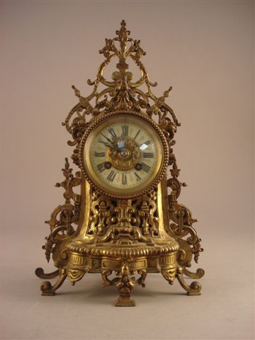 PENDULE en bronze ciselé et doré à décor de rinceaux stylisés, enroulements de volutes et frise de godrons. Repose sur quatre petits pieds cambrés. Cadran émaillé crème avec indication des heures en chiffres romains rehaussés de noir. Signé " GRANDE MÉDAILLE D'OR - JOULIN BLOIS".