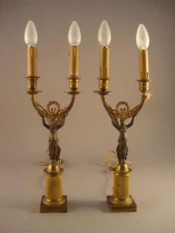 PAIRE DE CANDÉLABRES à deux lumières en bronze ciselé et doré. Le fût constitué d'une victoire à patine brune portant les deux bobèches, reposant sur une demi-sphère portée par un fût cylindrique se terminant par une base carrée. Montés pour l'électricité.
