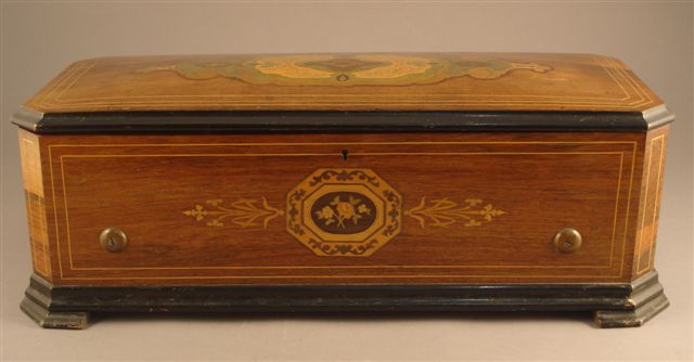 BOITE À MUSIQUE 6 airs. Coffret en bois de placage de forme rectangulaire à pans coupés. La façade et le couvercle centrés de cartouches octogonaux fleuris. Porte une étiquette : J.H. HELLER à Bern. Remontage à levier, cylindre 33,5 cm. Carte d'airs. Fin XIXème siècle.