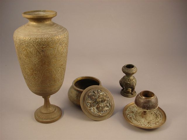 VASE ovoïde en bronze. Panse renflée et ciselée à décor de griffons. Piédouche godronné. On y joint deux pyrogènes et une boîte en bronze à panse renflée, sculptée d'insectes sur le couvercle.