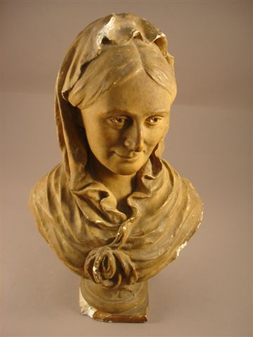 BUSTE en plâtre à l'imitation de la terre cuite représentant la comtesse Octave de Bazelaire de Lesseux née Marguerite de Warren. Porte une signature au revers illisible et une date "1883".