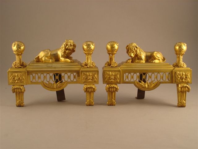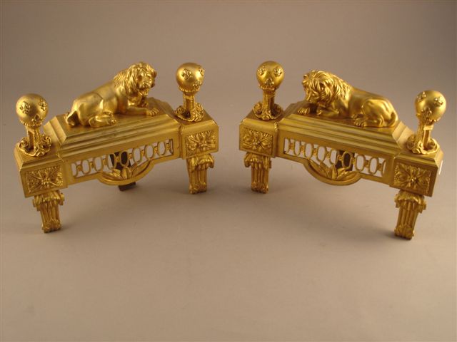 PAIRE de CHENETS en bronze ciselé et doré à décor de lions couchés. Paire de sphères fleurdelisées sur un fût orné de trois dauphins affrontés encadrant les fauves. Frise ajourée d'entrelacs et rosaces stylisées. Pieds cannelés à décor d'enroulement de feuilles d'acanthe. Avec leurs fers.