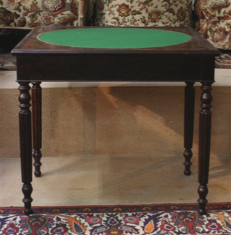 TABLE À JEU de forme rectangulaire en acajou et placage d'acajou flammé. Pieds fuselés, cannelés terminés par des bulbes.