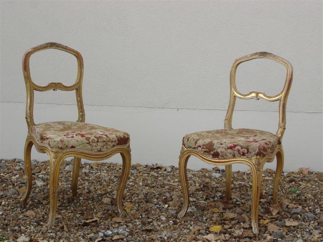 PAIRE DE CHAISES en bois doré, mouluré et sculpté à décor de bouquets de fleurs. Dossier ajouré. Ceinture mouvementée. Pieds galbés et nervurés. Garniture de velours à motif de fleurs (déchirures).