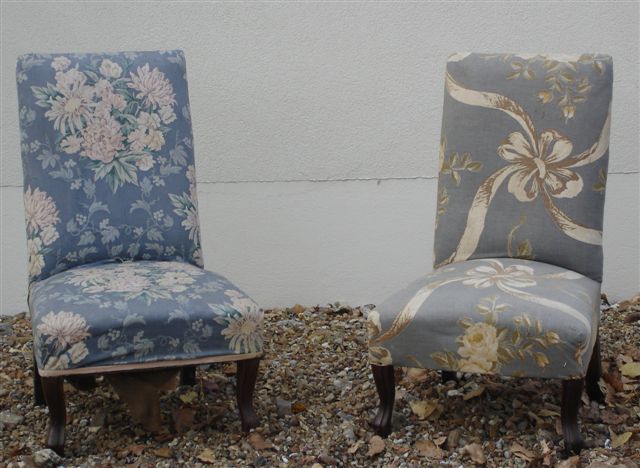Réunion de 3 FAUTEUILS et 1 CHAISE. Suite de 2 fauteuils à dossier haut, pieds galbés terminés par des roulettes. Dossier et siège garnis de tissu imprimé. On y joint un fauteuil en cabriolet, dossier incurvé, ceinture droite, pieds en balustre; et une chaise à dossier droit, recouverte de tissu.