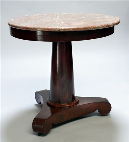 GUÉRIDON en acajou et placage d'acajou. Le fût évasé repose sur un piètement tripode à enroulements terminé par des roulettes. Dessus de marbre brèche.