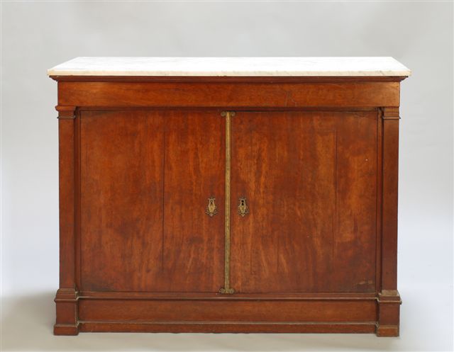 1 - SECRÉTAIRE À ABATTANT en acajou et placage d'acajou. Partie supérieure ouvrant à un tiroir et un abattant à contrepoids découvrant six tiroirs (un manquant) et trois casiers. Partie inférieure ouvrant à deux vantaux masquant une étagère et un tiroir. Les quatre montants sont à méplats. Dessus de marbre vert.