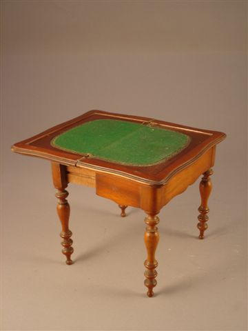 Petite TABLE À JEU pour enfant en merisier mouluré. Un tiroir en ceinture. Plateau pliant. Ceinture chantournée. Pieds tournés.