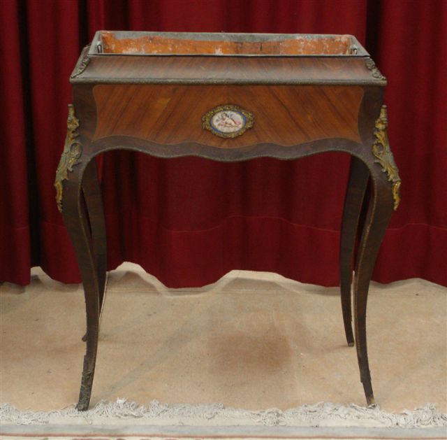 JARDINIÈRE en bois de rose marqueté en feuilles à décor de médaillons en porcelaine polychrome. Pieds cambrés. Ornementation de bronzes dorés et ciselés : sabots, chutes d'angles.