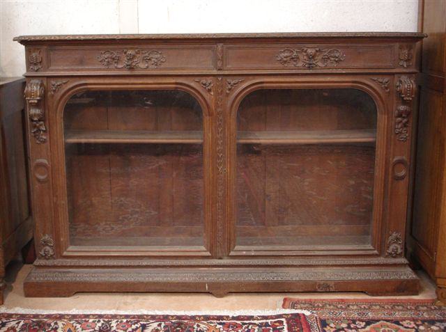 BUFFET en bois naturel mouluré et sculpté de feuillages, pampres et fleurs stylisées. Il ouvre à deux tiroirs en ceinture et deux portes vitrées dans la partie inférieure découvrant trois étagères. Panneaux moulurés. Les montants réunis par une plinthe sculptée d'une frise feuillagée.