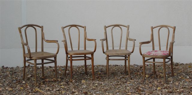 Suite de 4 FAUTEUILS à dossier ajouré légèrement cintré. Accotoirs renversés, ceinture bombée, piètement antérieur et postérieur arqué. Porte une inscription à l'encre "THONET AUSTRIA" et une étiquette "THONET WIEN".