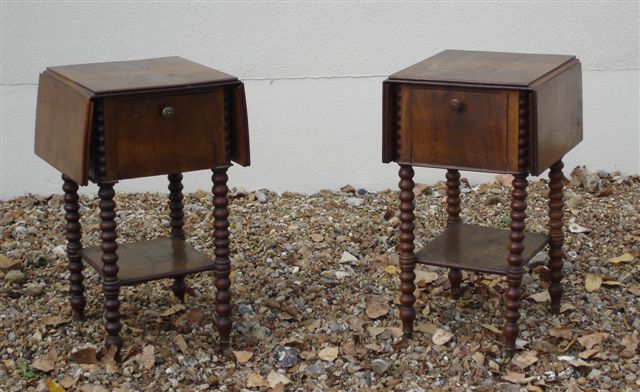 PAIRE DE PETITES TABLES rectangulaires en bois de placage. Un tiroir en ceinture. Deux abattants latéraux amovibles. Piètement en spirale terminé par des roulettes.