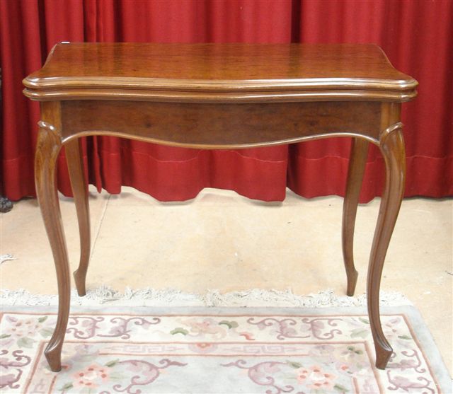 TABLE À JEU de forme rectangulaire en acajou et placage d'acajou. Plateau basculant à deux volets. Elle repose sur quatre pieds cambrés et nervurés.