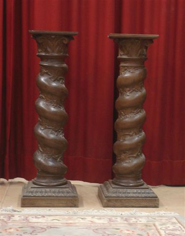 PAIRE DE COLONNES TORSES en bois naturel mouluré et sculpté de pampres. Elles sont couronnées de chapiteaux corinthiens à feuilles d'acanthe qui supportent un plateau. Socles à décor de feuilles stylisées et base moulurée.