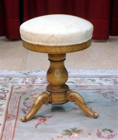 TABOURET de piano en érable moucheté et incrustations de palissandre. Le fût balustre reposant sur un piètement tripode en enroulement de volutes.