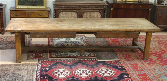 TABLE DE COMMUNAUTÉ rectangulaire en chêne massif ouvrant à deux larges tiroirs en ceinture. Piètement droit réuni par une entretoise en H.