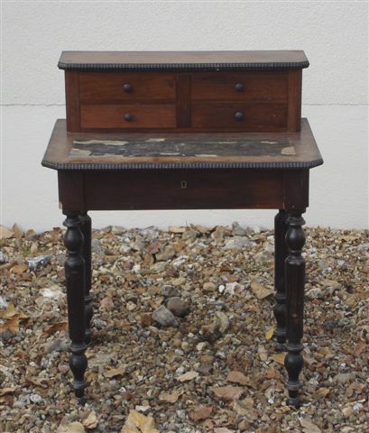 Petit BUREAU à gradin en bois mouluré. Quatre tiroirs à la partie supérieure, un tiroir en ceinture. Plateau guilloché. Piètement tourné. Il repose sur de petits pieds boule. Garniture de vieux cuir doré aux petits fers (usures et déchirures).
