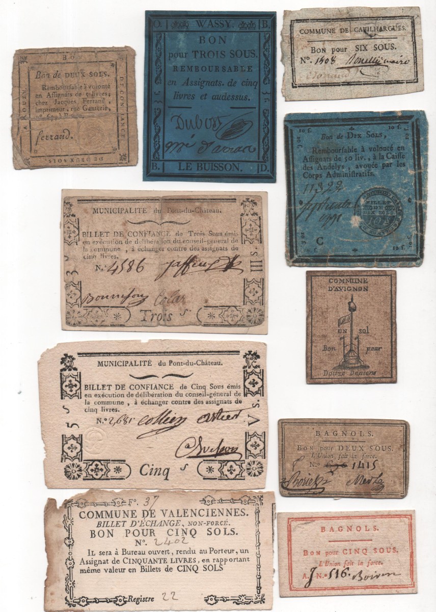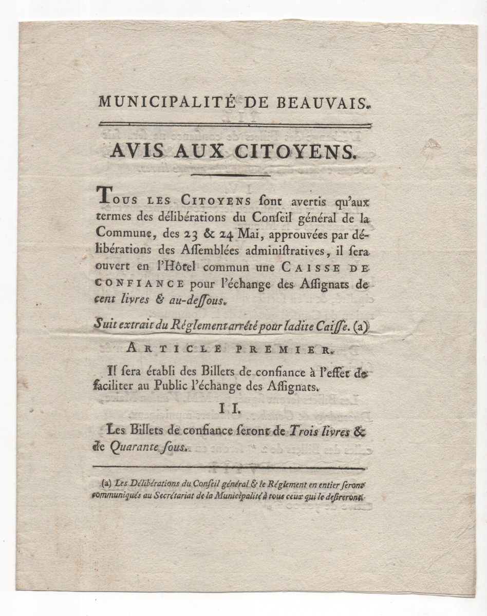 Des monnaies dites de confiance furent émises par des villes ou des particuliers, sous la forme de pièces métalliques ou de billets de valeur faciale généralement peu élevée. On décide par la loi du 1er avril 1792 de laisser en circulation les billets émis par les sociétés et les particuliers, après le contrôle de leur caisse, mais de leur interdire toute nouvelle émission. En revanche, les municipalités ont seules le droit de continuer les émissions, et même d'ouvrir de nouvelles caisses. Ces billets, créés initialement pour résoudre les difficultés financières locales, se sont répandus, par les foires et les marchés, dans toute la France.
