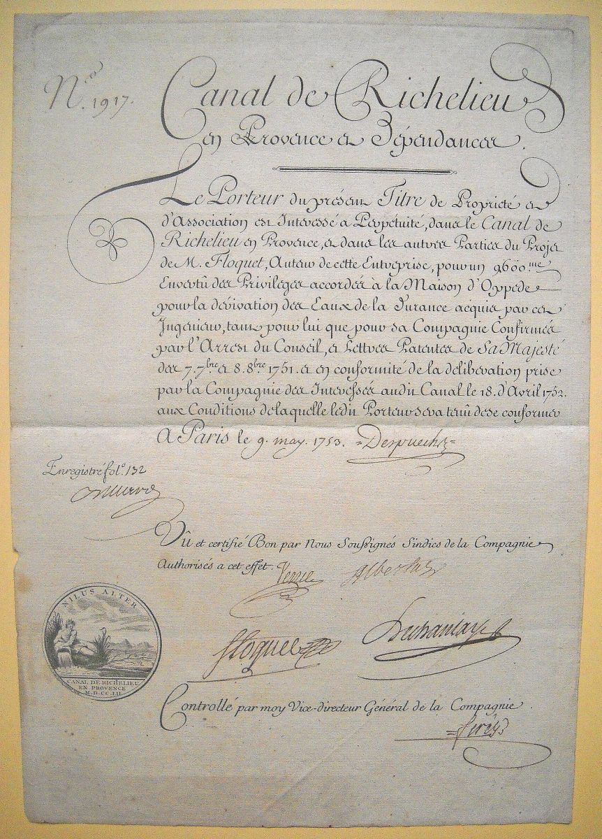 ![Lot 41 - [Louis XV - Actions] Canal de Richelieu en Provence et... [Louis XV - Actions] Canal de Richelieu en Provence et...](<150:ddoc-614158-da3a8976abbd13c61c9c851a067ce94e-p100201529500902.jpg, <480:ddoc-614159-99f1f76d9638023993287a934d1dbdc5-p100201529500902.jpg, <640:ddoc-614160-2acae6ad60c2968b3e110228f3caa583-p100201529500902.jpg, >640:ddoc-614157-2e4c2709e6131ed5be577d4fc40bc986-p100201529500902.jpg)