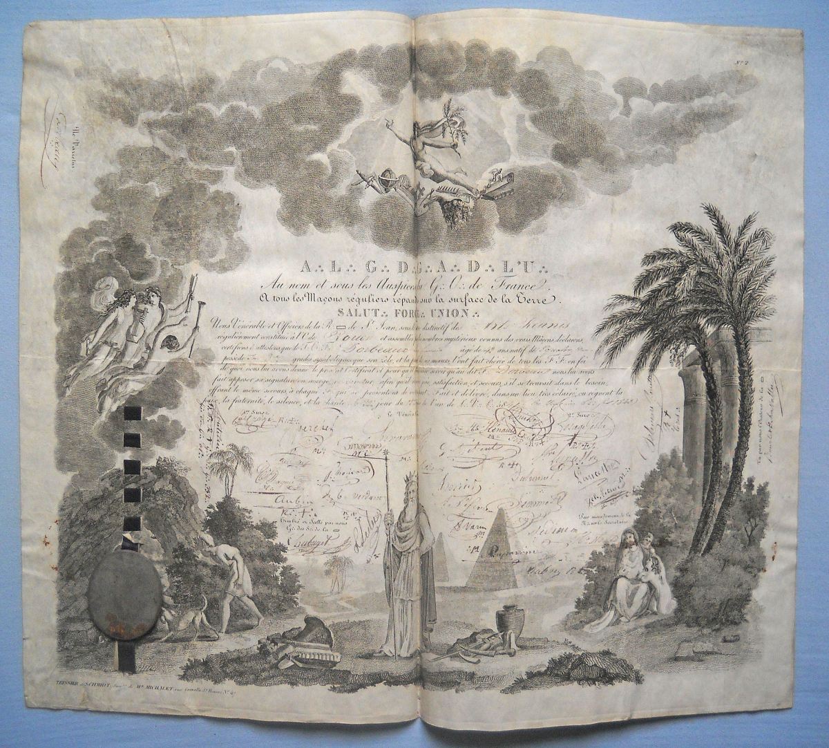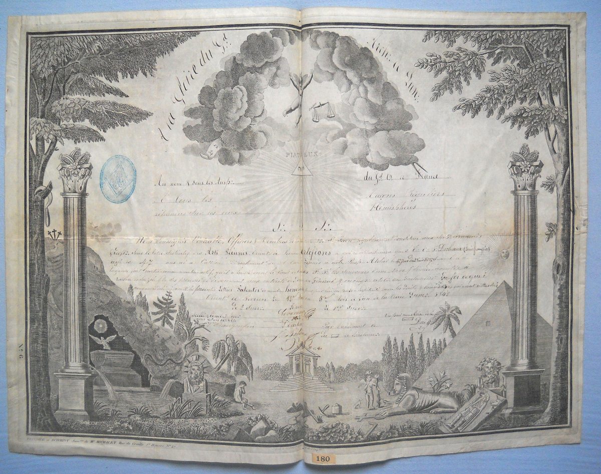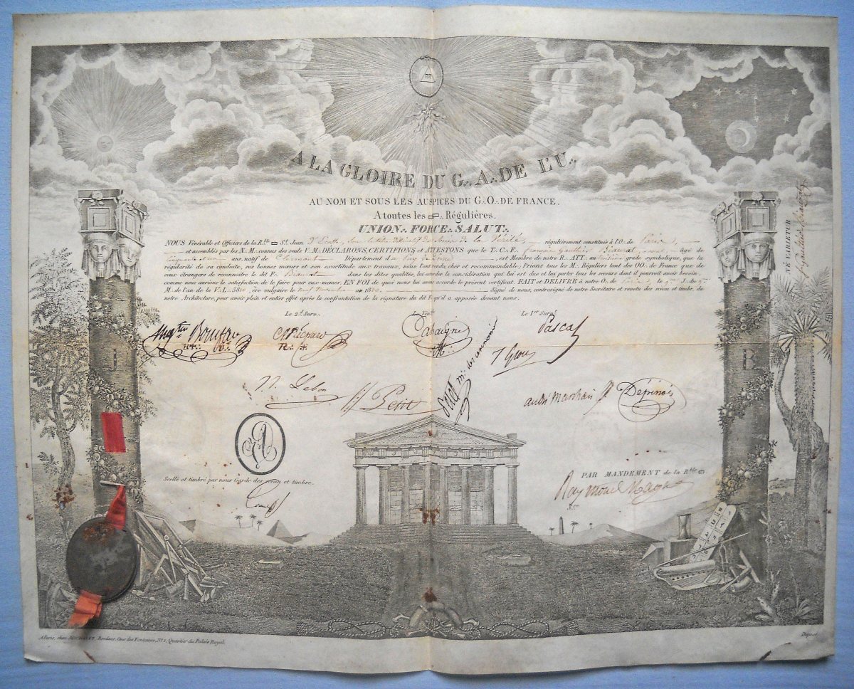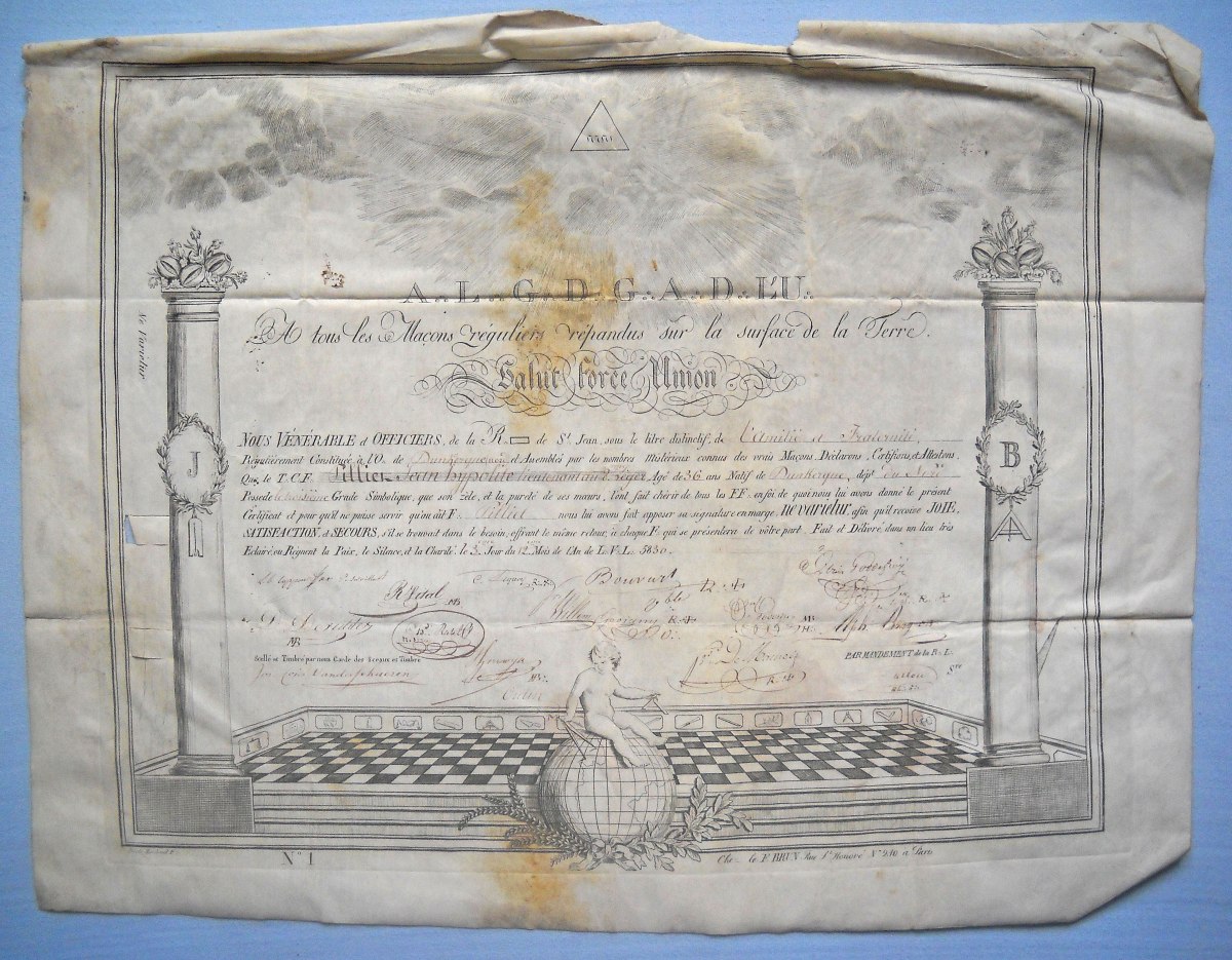 12 diplômes sur parchemin décernés par la : loge de " L'Amitié et Fraternité " à Dunkerque en 1830 ; loge des " Amis de la Vérité " à Paris en 1830 avec boite de métal et ruban ; loge " Les enfants d'Hiram " à Lyon en 1832 ; loge du " Val d'Amour " à Dôle en 1833 avec boite de métal et ruban ; loge de " Mars et les Arts " à Paris en 1835 ; loge de " La Parfaite Harmonie et du Feu Sacré " à Clermont-Ferrand en 1835 avec boîte de métal et rubans ; loge du " Triangle Sacré " à Corbeil en 1839 avec boîte de métal, cachets de cire et rubans ; loge de " La Rose Étoilée régénérée " à Lille en 1841 ; loge des " Arts Réunis " à Rouen en 1841 avec boîte de métal et ruban ; loge de " L'Égalité régénérée " à St Jean d'Angély à 1844 ; loge de " L'Accord Parfait " à Rochefort en 1845 avec boîte de métal et ruban ; loge des " Arts réunis " à Rouen en 1848.