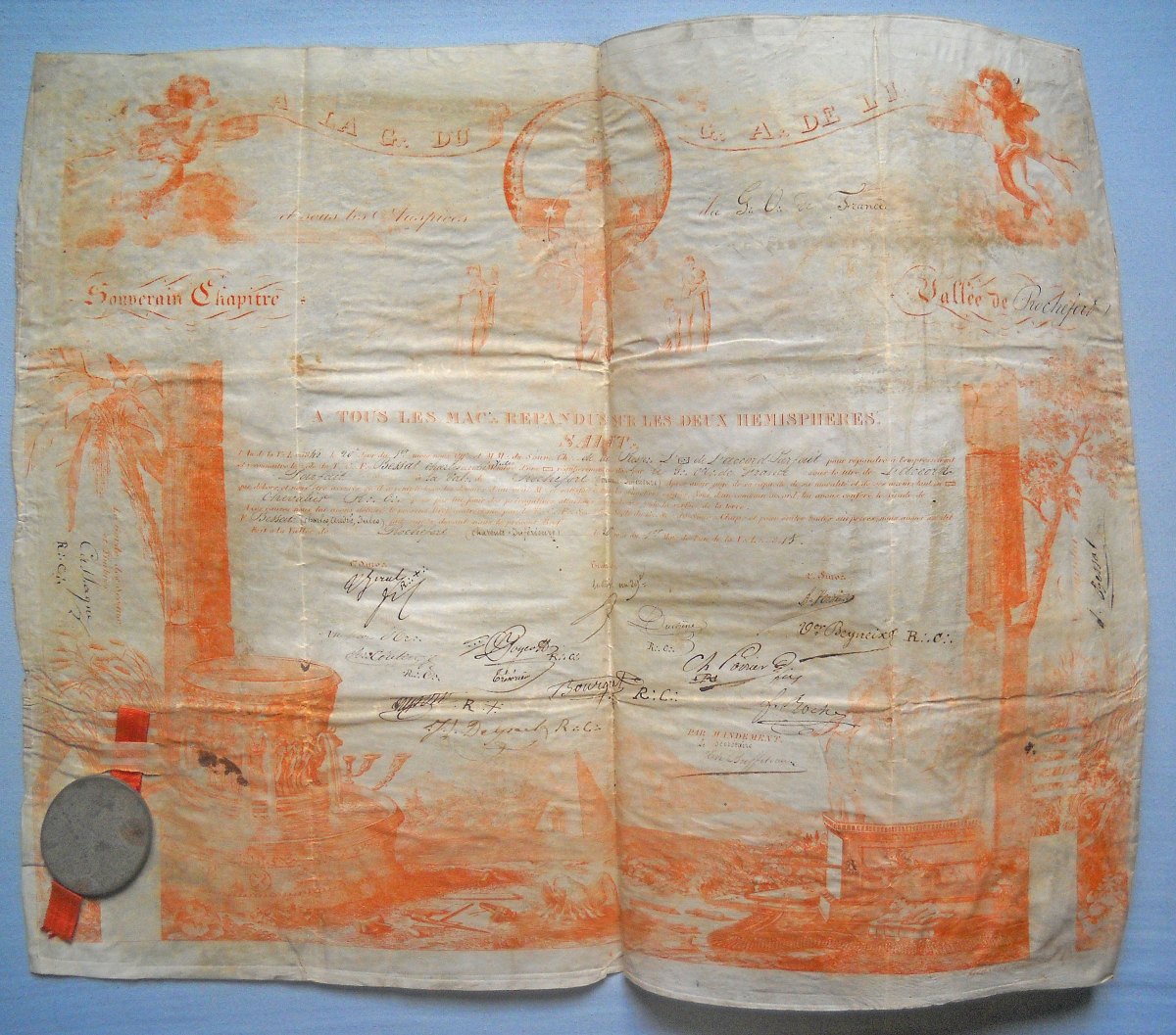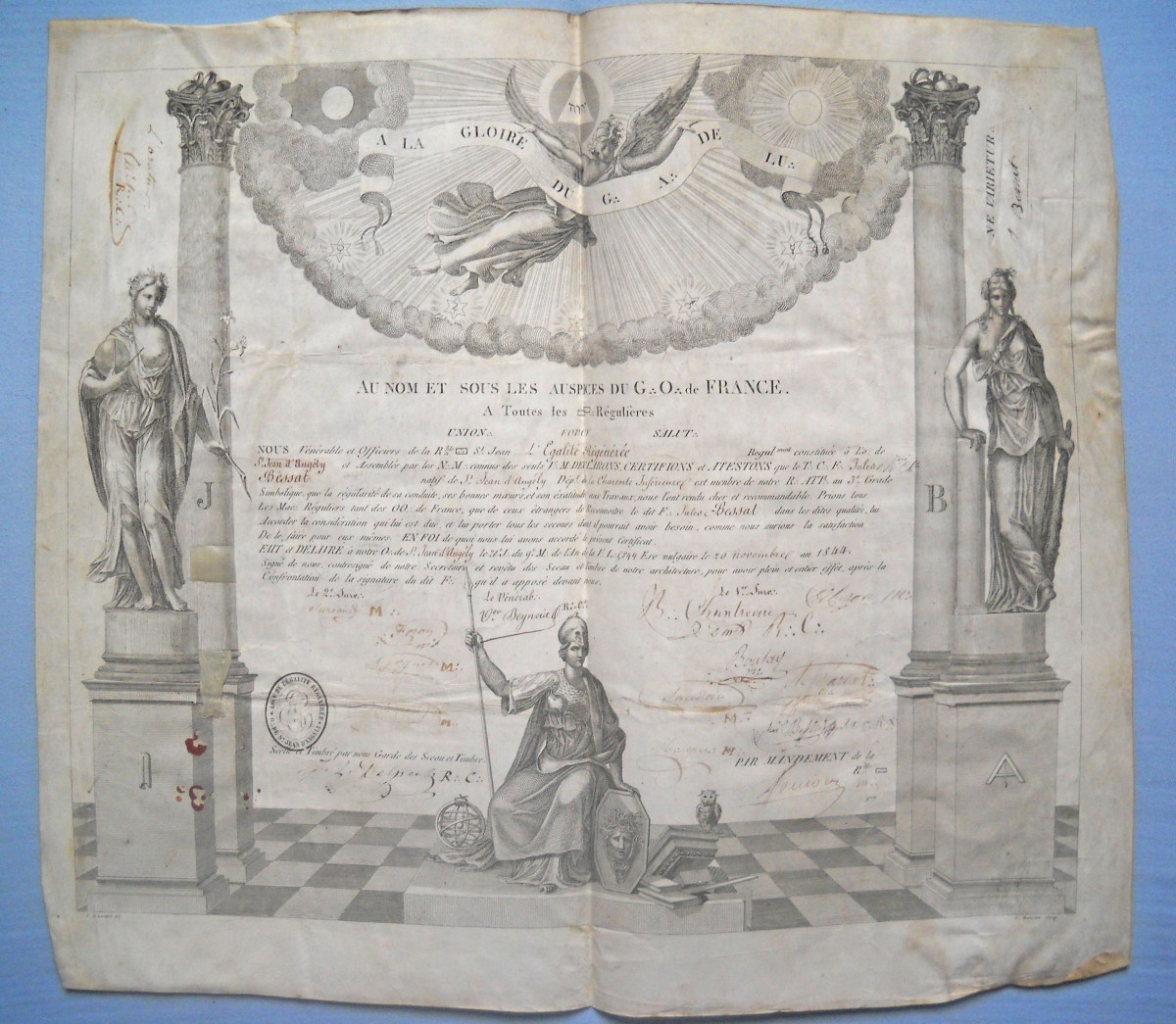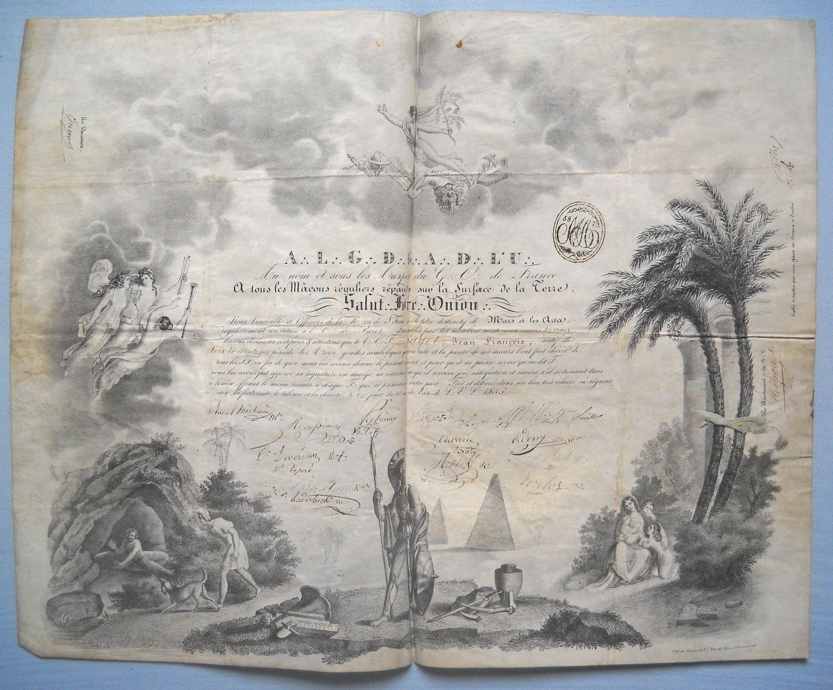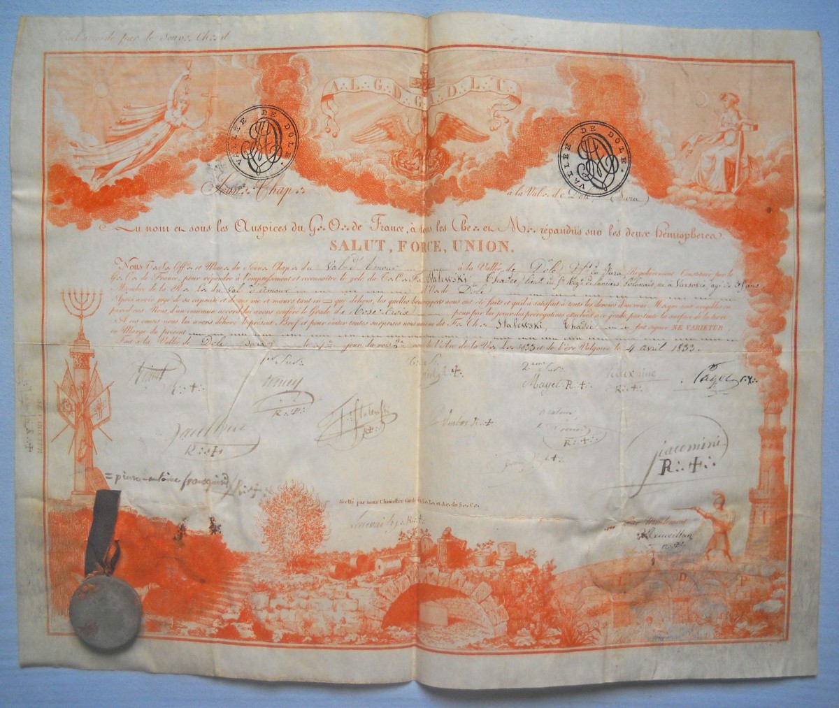 12 diplômes sur parchemin décernés par la : loge de " L'Amitié et Fraternité " à Dunkerque en 1830 ; loge des " Amis de la Vérité " à Paris en 1830 avec boite de métal et ruban ; loge " Les enfants d'Hiram " à Lyon en 1832 ; loge du " Val d'Amour " à Dôle en 1833 avec boite de métal et ruban ; loge de " Mars et les Arts " à Paris en 1835 ; loge de " La Parfaite Harmonie et du Feu Sacré " à Clermont-Ferrand en 1835 avec boîte de métal et rubans ; loge du " Triangle Sacré " à Corbeil en 1839 avec boîte de métal, cachets de cire et rubans ; loge de " La Rose Étoilée régénérée " à Lille en 1841 ; loge des " Arts Réunis " à Rouen en 1841 avec boîte de métal et ruban ; loge de " L'Égalité régénérée " à St Jean d'Angély à 1844 ; loge de " L'Accord Parfait " à Rochefort en 1845 avec boîte de métal et ruban ; loge des " Arts réunis " à Rouen en 1848.