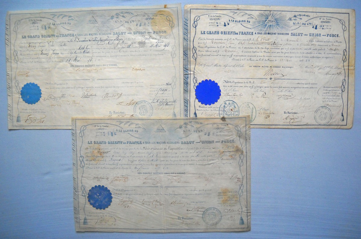 6 diplômes sur parchemin décernés par la : loge des " Amis Triomphants " à Laval en 1849 avec boîte de métal et cachets de cire rouge ; loge des " Frères Unis régénérés " à Marseille en 1852 ; loge de " Cérès et les Amis de l'Agriculture " à Longjumeau en 1857 ; loge de " Jérusalem des vallées Egyptiennes " à Paris en 1858 ; loge de " La Vérité " à Marseille en 1867 ; loge de " La Prévoyance " à Paris en 1868 ;