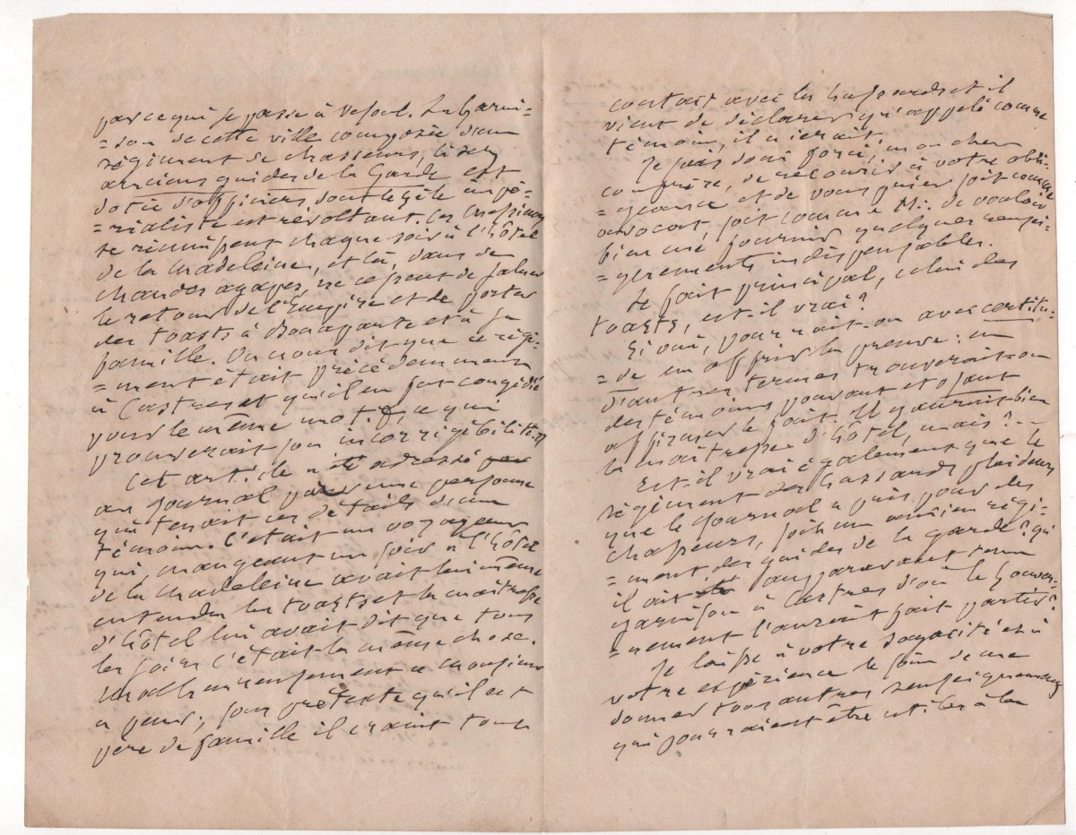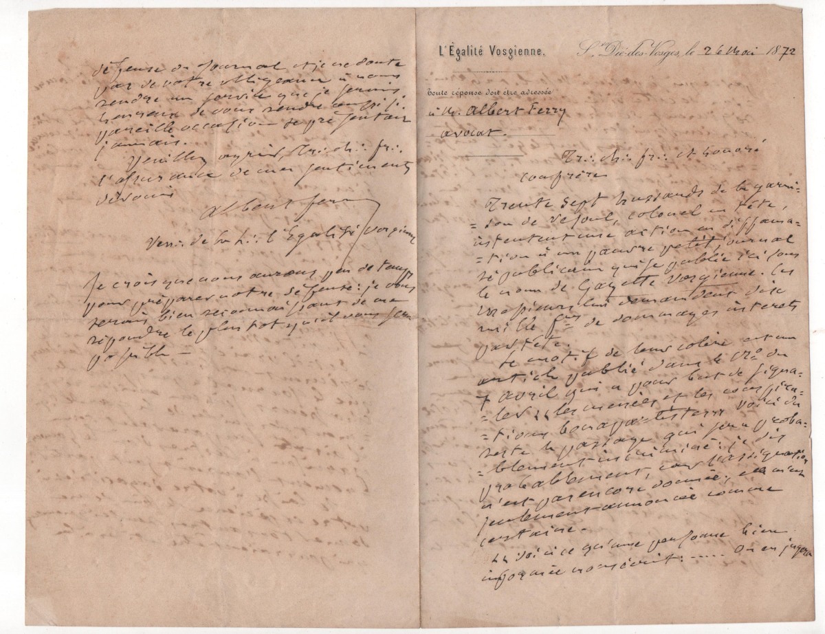 L.A.S. par Albert Ferry, avocat et membre de la loge maçonnique de " L'Égalité Vosgienne " à Saint Dié des Vosges, écrite le 26 mai 1872 adressée à un confrère maçon : " Trente sept hussards de la garnison de Vesoul, colonel en tête, intentent une action en diffamation à un pauvre petit journal républicain que je publie ici sous le nom de Gazette Vosgienne. (