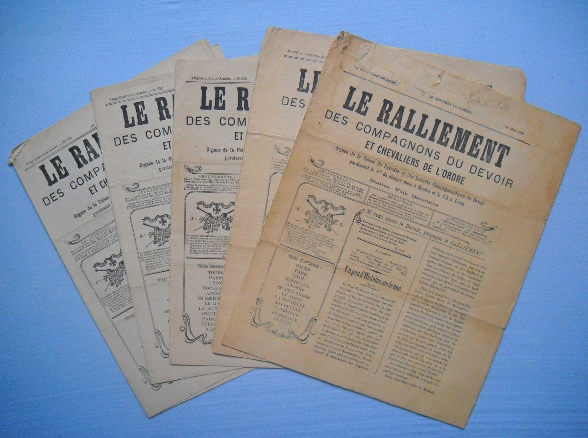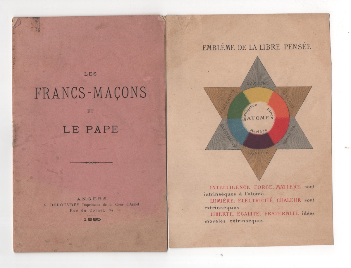 ) le motif de leur colère est un article publié dans le n° du 7 avril qui a pour but de signaler " les menées et les conspirations bonapartistes " - carte " Emblème de la libre pensée " - 6 numéros du journal d'informations compagnonniques " Le Ralliement des compagnons du devoir et chevaliers de l'ordre ", 1908, éditions de Nantes et de Tours - Plaquette " Les Francs-maçons et le pape ", discours prononcé par l'ordre de la loge " La Persévérance " à Saumur le 18 janvier 1885, 23 pp., in-12.