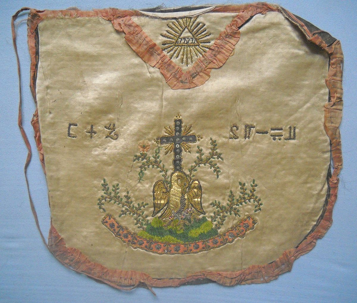 [Tablier] 2 tabliers de Chevalier Rose-Croix en en soie, velours, fil doré et broderie au petit point, décor au Pélican à la croix. Cannetilles et broderies de coton. Delta rayonnant sur la bavette. Bordure plissée en soie. XIXe siècle. En l'état.