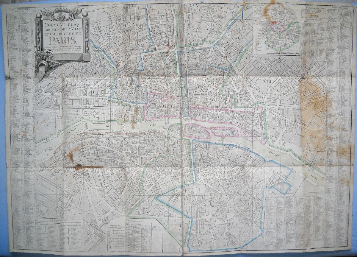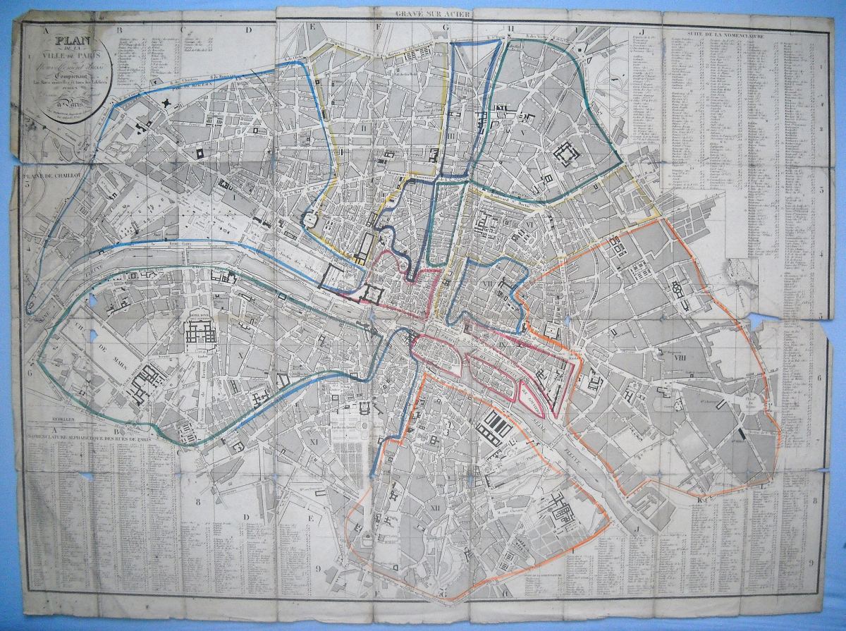 an 9 ". Coloris d'époque. 56 x 79 cm. Plié. Petits défauts et mouillures. - " Plan de la Ville de Paris Nouvellement dressé Comprenant les Rues nouvelles et tous les Edifices publics. Dessiné par E. Hocquart " [1831]. 51 x 70 cm. En l'état. - " Plan pittoresque de la ville de Paris