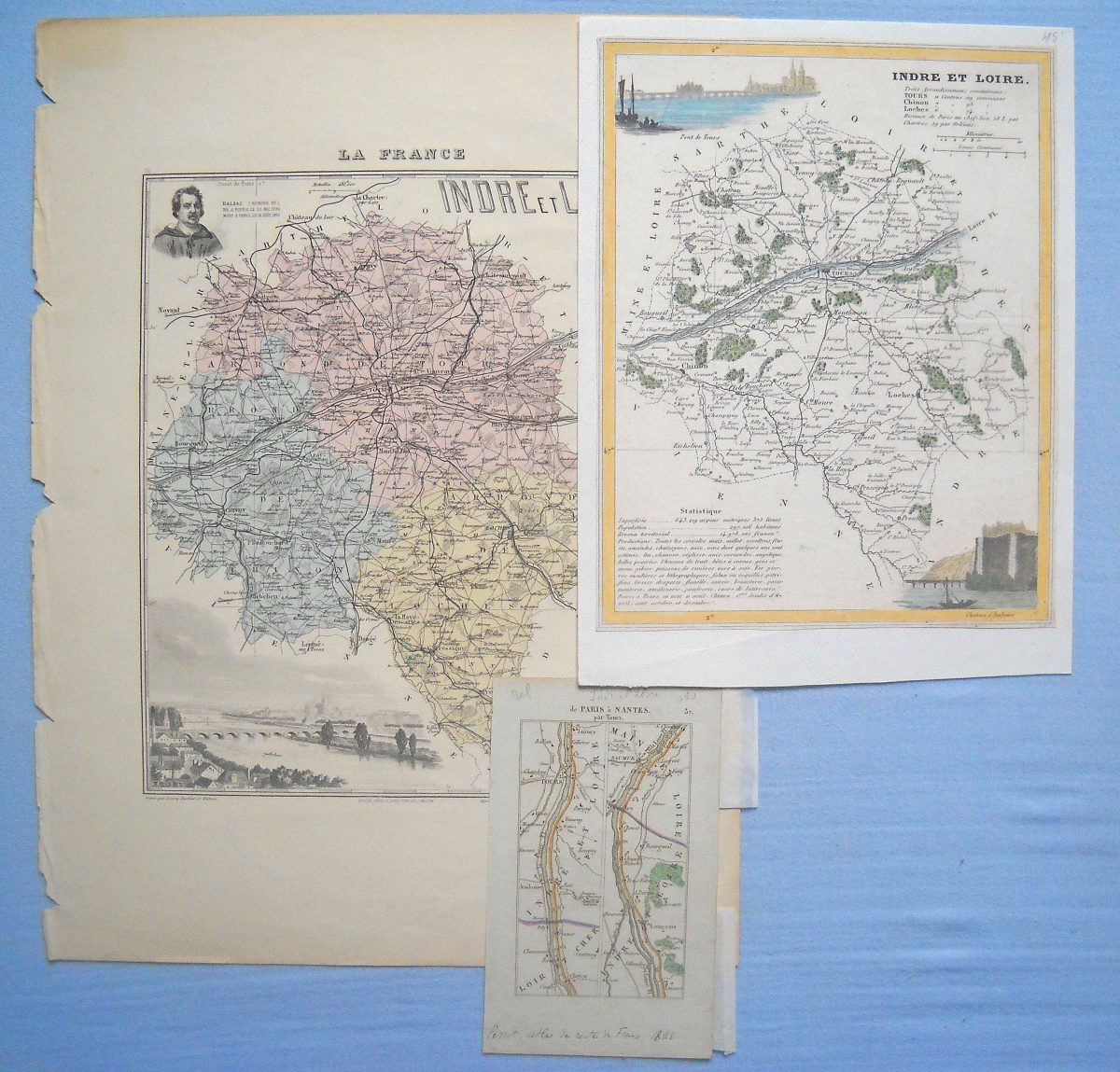 " Carte du Chinonois " gravée par Hennequin et impr. A Paris chez Henri Feret, montée sur carton fort - Carte de " La France, Indre-et-Loire ", gravée par Lecocq, Barbier et Waltner, édit. Migeon - Carte d' " Indre-et-Loire " avec vue du pont de Tours et château d'Amboise - Carte d' " Indre-et-Loire " gravée sous la direction de P. Tardieu - " Plan de la ville de Tours