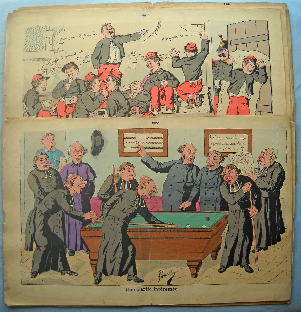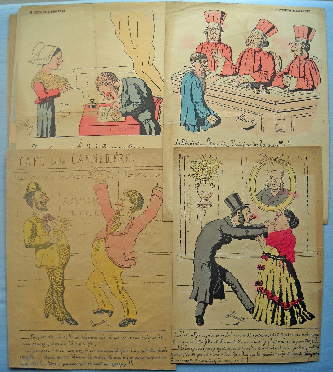 Joint : 8 lithographies couleurs par Lavrate, env. 32 x 25 cm dont Café de la Cannebière, Une expérience de Mr. Pasteur, Réunion électorale, etc. - 9 lithographies par Lavrate parue dans La Lanterne.