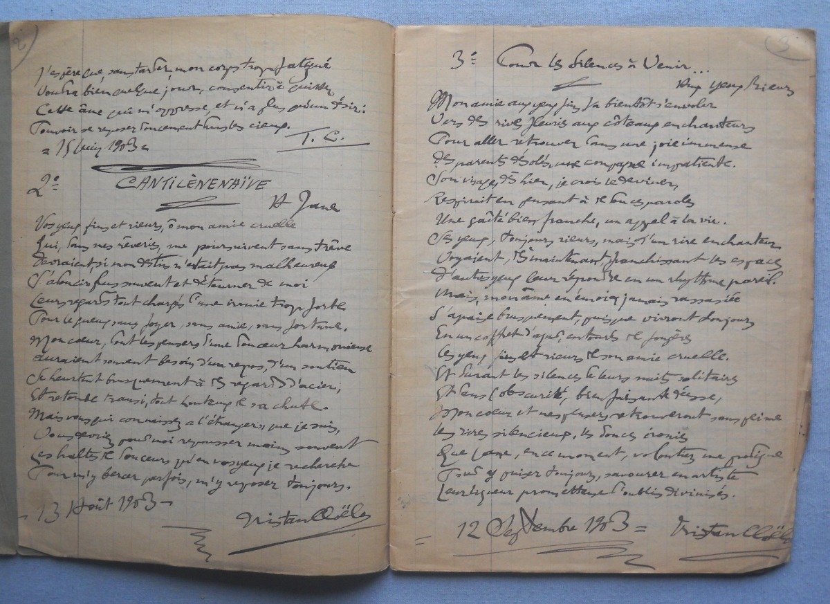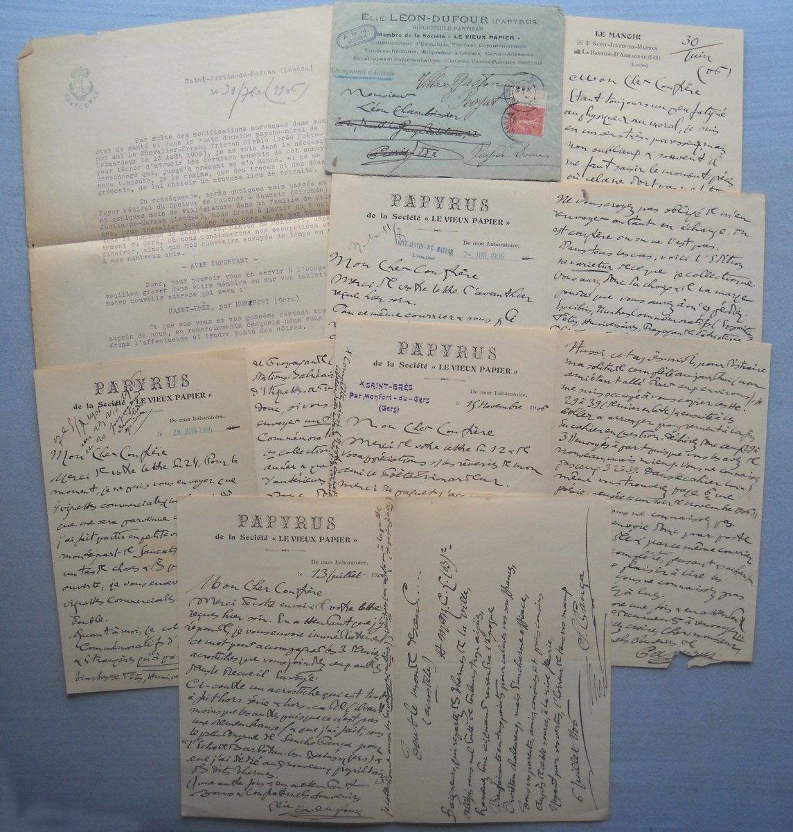 1 cahier d'écolier contenant des poèmes, pensées et acrostiches écrits par " Tristan Cloëlo le poète-Trimardeur " et 5 L.A.S., 1 lettre dactylographiée, datées de 1906 et adressés par Elie LEON-DUFOUR à Léon CHAMBOISSIER, tous deux membres de la société " Le Vieux Papier ", association fondée à Paris en 1900. Elie Leon-Dufour est un bibliophile, illustrateur, collectionneur et un poète écrivant sous le pseudonyme du " Chevalier-errant Tristan Cloëlo ".