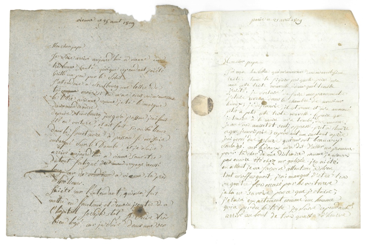 Lot de 11 documents manuscrits, dont 5 L.A.S. écrites de Paris en 1809, 2 L.A.S. de Vienne (Autriche) en 1809 ; certificat de scolarité délivré par le collège impérial de Vendôme, 28 juillet 1809 ; attestation de nomination dans l'armée d'Allemagne, 18 septembre 1809, avec beau cachet de cire ; L.A.S. du directeur des hôpitaux de l'armée d'Allemagne, à Vienne, 8 février 1810 ; L.S. de Jean Bérenger, conseiller d'état, comte de l'Empire et directeur général de la caisse d'amortissement, Paris, 20 juillet 1810, avec marques postales de la caisse d'amortissement.