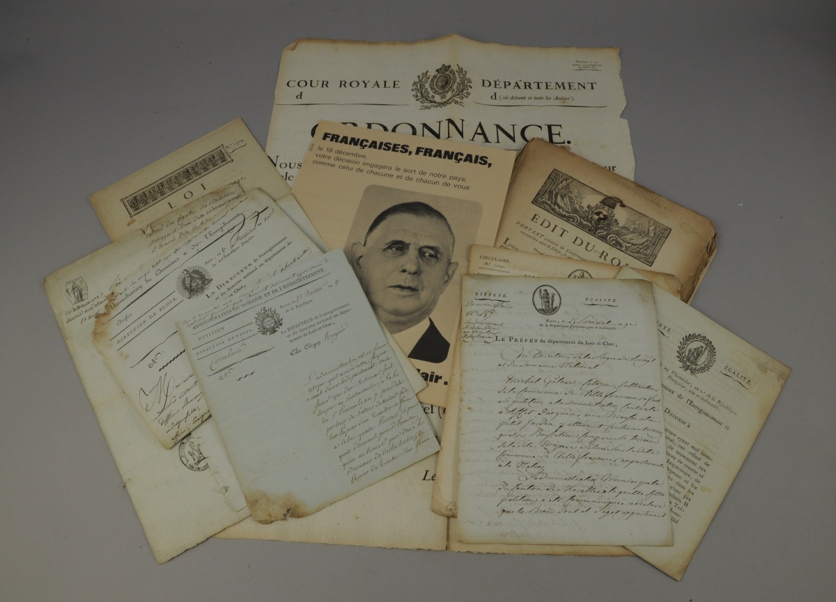 [Vieux papiers] LOT de 15 VIEUX PAPIERS dont circulaires administratives des "Agdministration de l'Enregistrement et des Domaines" signées, État Civil, arrêt de la Cour Royale. XVIIIème et XIXème.