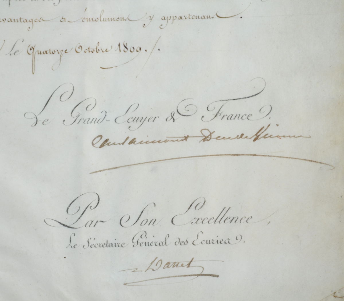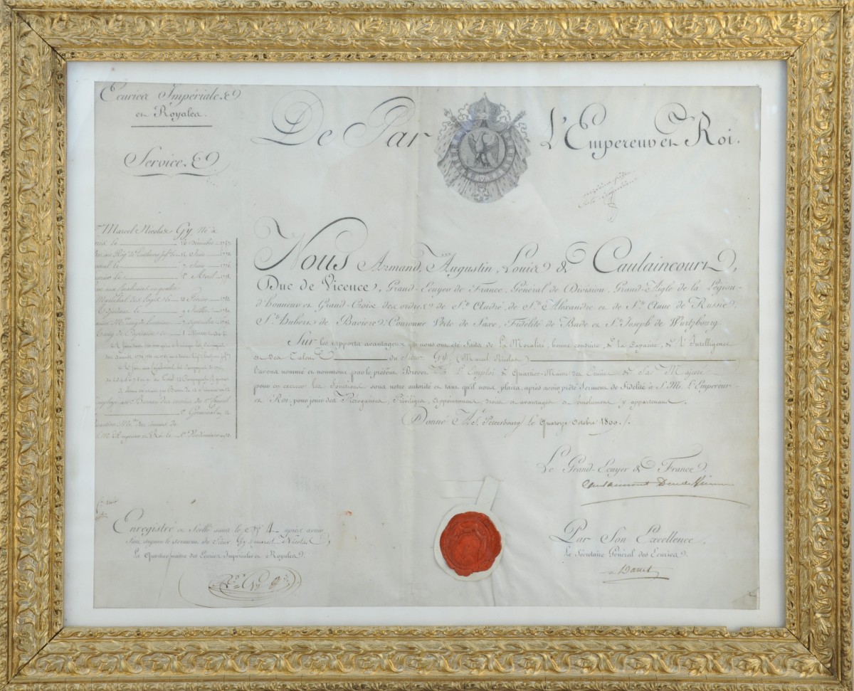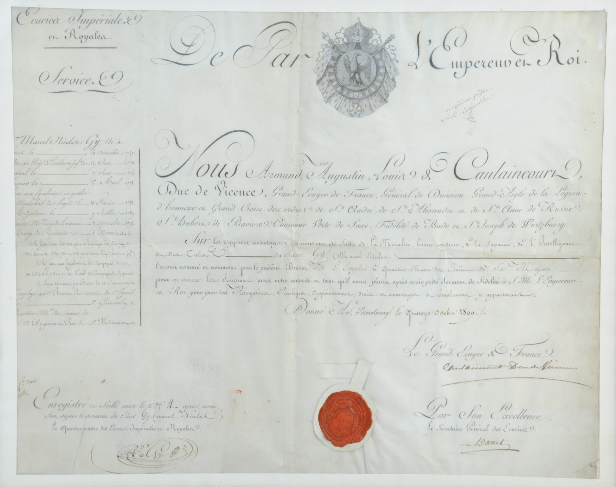 [Premier Empire] Brevet sur parchemin : nomination de Nicolas Gy comme Quartier-Maître des écuries impériales. Signé du Grand Ecuyer de l'Empereur et Roi Armand de CAULAINCOURT, duc de Vicence, à Saint Pétersbourg le 14 octobre 1809.