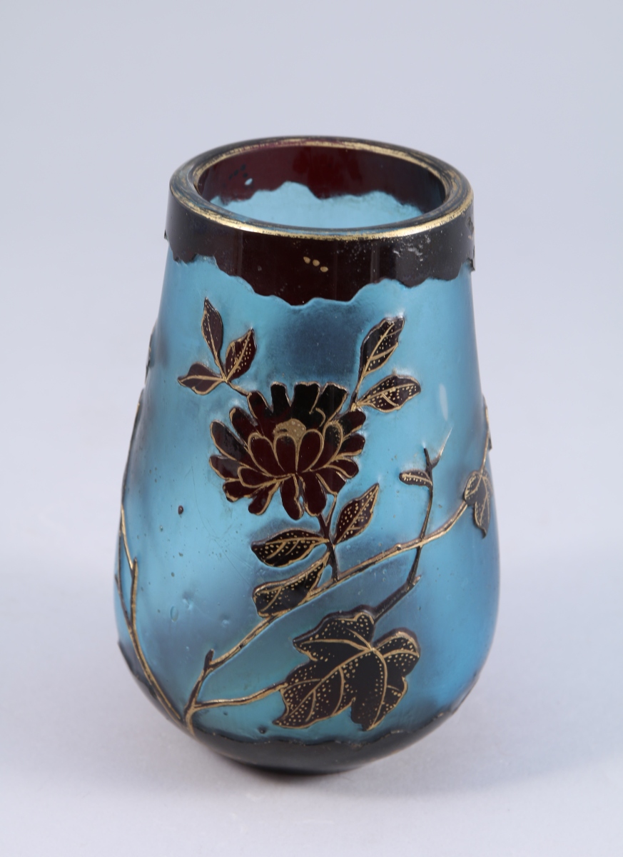 HARRACH. VASE tronconique à panse basse renflée en verre bicouche, rouge et bleu, gravé à la roue d'un rameau fleuri. Rehauts or.