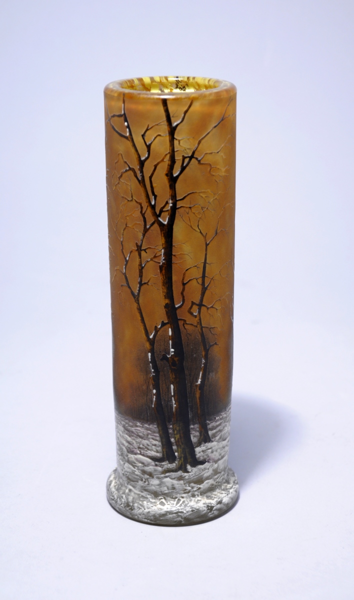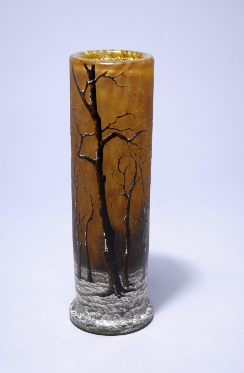 DAUM NANCY. Rare VASE ROULEAU en verre doble épais au décors d'arbre en hiver dégagé à l'acide puis peint.