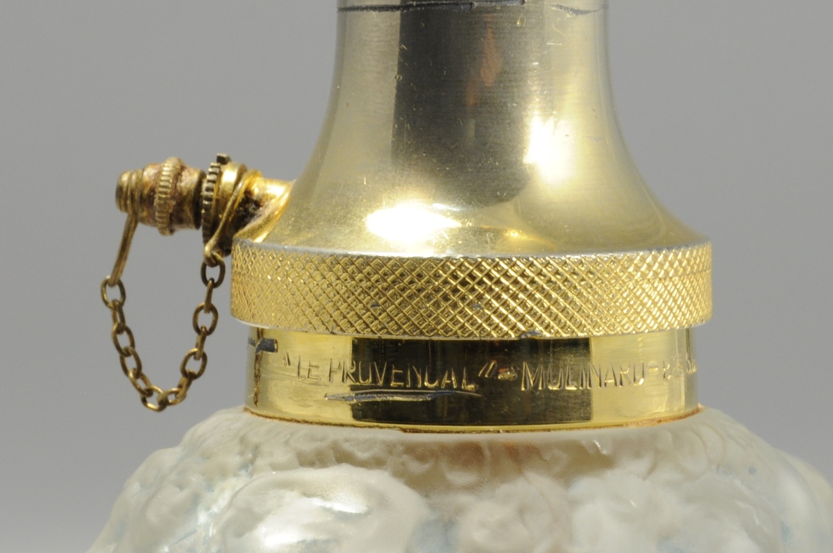 LALIQUE pour MOLINARD. FLACON DE PARFUM dit ATOMISEUR "Calendal", en verre soufflé-moulé orné d'une sarabande de 12 baccantes. Traces de peinture bleue.