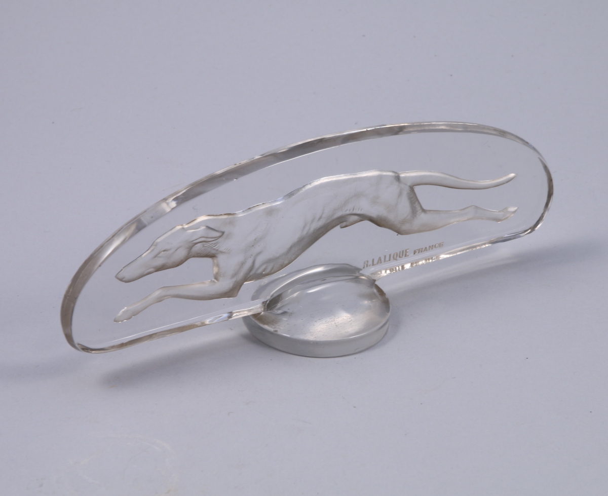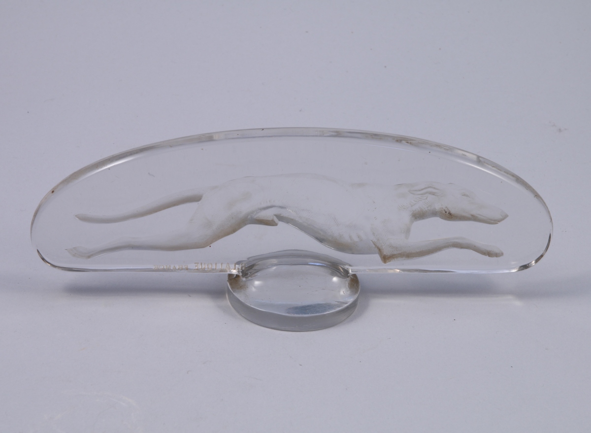 LALIQUE. BOUCHON DE RADIATEUR au LÉVRIER en verre blanc moulé et pressé, de forme ovale. Signé "R. Lalique France" et gravé "Trav. Ind. Elec".