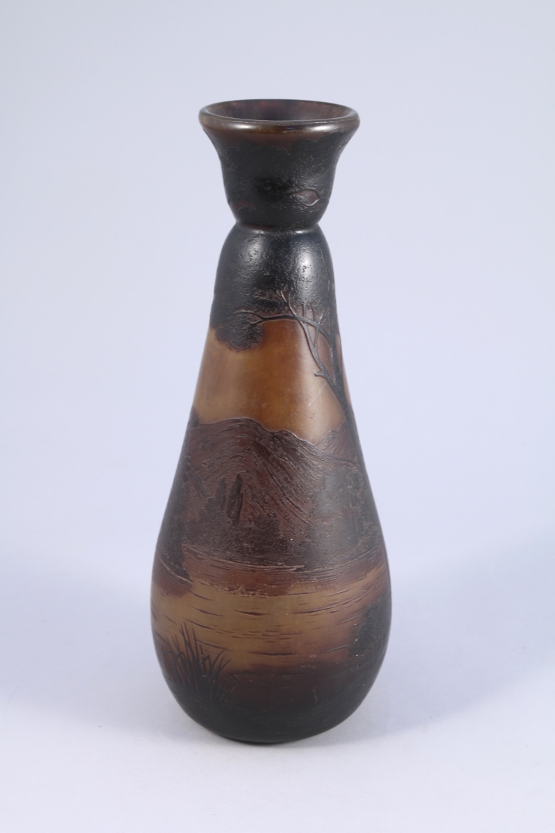 VASE GOURDE en verre multicouche gravé d'un paysage aux pins parassols et au château médiéval en bord de rivierre. Signé Richard.