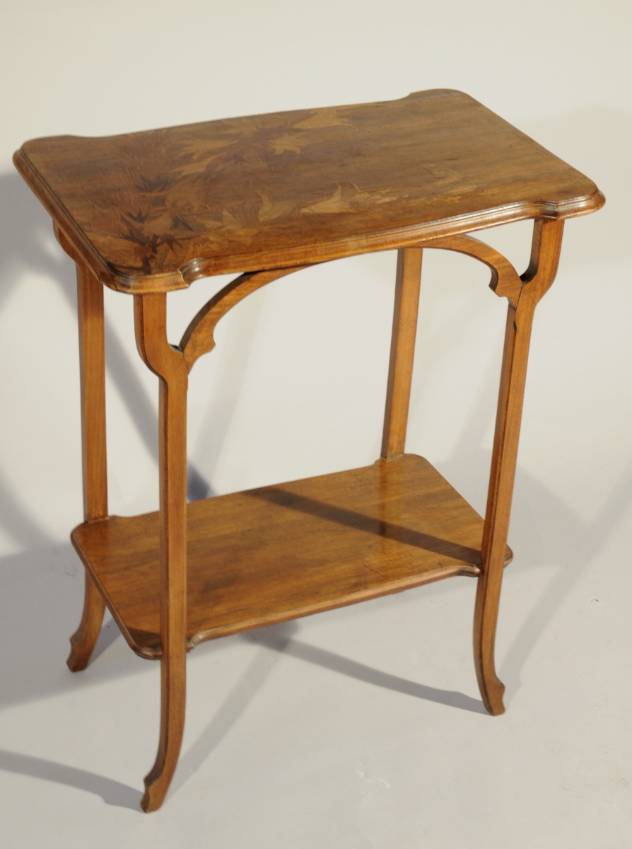 Décor marqueté de flore lorraine et papillons se déployant depuis l'angle inférieur gauche sur le plateau supérieur. Pieds légèrement galbés se scindant en deux pour former un arc en plein cintre soutenant le plateau supérieur.