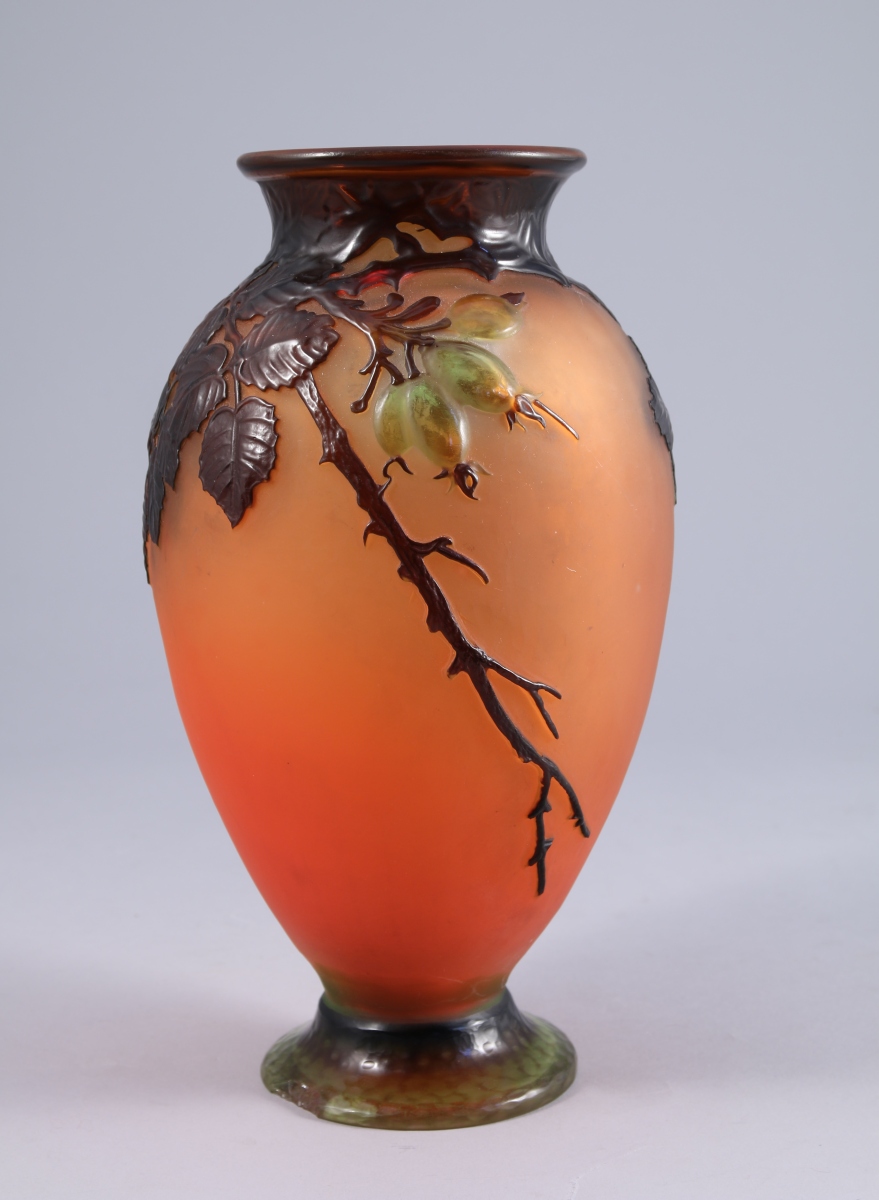 GALLÉ. VASE balustre en verre pressé et moulé à décor de fruits d'églantier de couleur jaune et prune sur un fond orangé.